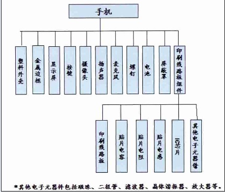 一部手機往往包括數千個均質材料,圖1所示的是手機的基本組成情況。構成手機最主要的零部件有:塑料外殼、金屬邊框、顯示屏、按鍵、攝像頭、揚聲器、麥克風、電池、屏蔽罩、印刷線路板組件等。印刷線路板組件又包括印刷線路板以及上面的錫鉛焊料、貼片電阻、貼片電容、貼片電感、I C芯片以及其他元器件。在這些基本組成中,有些零部件會因為需要實現一些特定性能而使用有害物質。