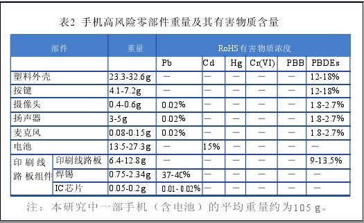 將表2列出的手機高風險零部件的重量與其中RoHS有害物質的濃度分別相乘匯總后可以得到整機產品的有害物質含量,其計算結果見表3。