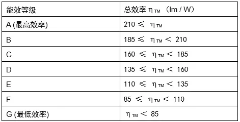 標簽能效等級計算:?TM = (Φuse / Pon) X FTM 單位:(lm/W)
