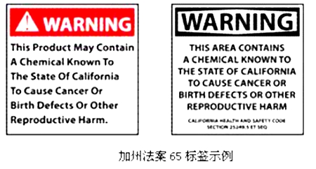 加州65號提案,即《1986年飲用水安全與毒性物質強制執行法》,于1986年11月頒發,該提案的目的是維護加州飲用水源不受已知致癌、生殖毒性的化學物質污染,維護大眾健康。提案要求商家通過清晰合理的標簽警告消費者產品中含有的已知毒性化學物質。目前已有超過900種化學品被列為此類化學品受到監管。該提案要求政府至少每年一次公布加州已知的致癌或含有生殖毒性的化學物質。