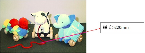 220mm;繩圈周長不能大于 380mm ;玩具如有自回縮繩,在標準測試條件下回縮長度不超過6mm。繩線危害為造成兒童勒死。